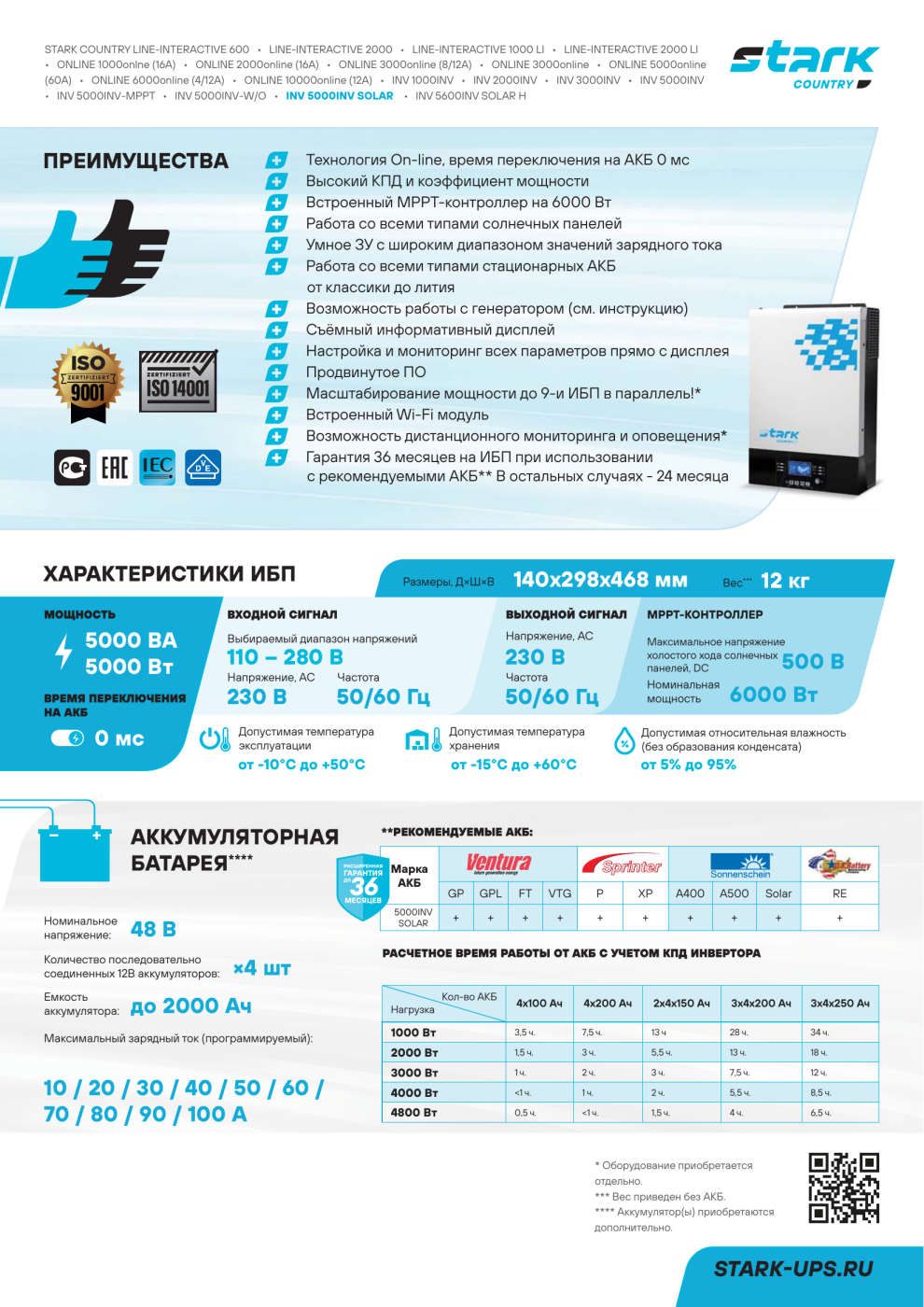 - Работа со всеми типами стационарных аккумуляторов (AGM, GEL, LiFePO4)