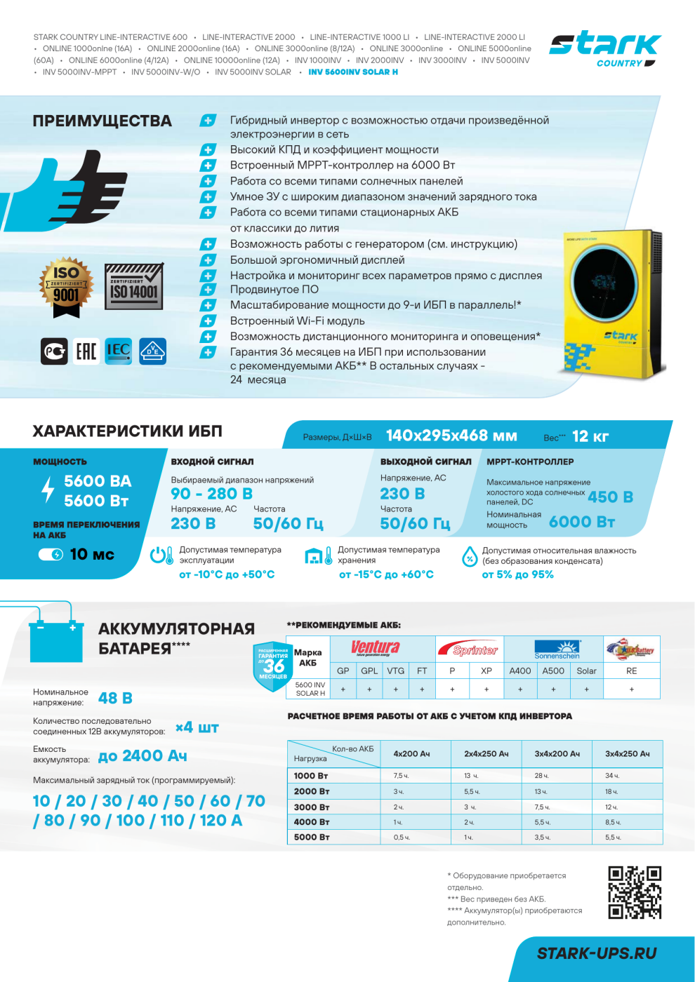 - Максимальный зарядный ток от PV, А: 10 / 20 / 30 / 40 / 50 / 60 / 70 / 80 / 90 / 100 / 110 / 120